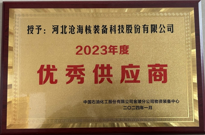 近日,河北滄海核裝備科技股份有限公司先后榮獲2023年度中國石油化工股份有限公司金陵分公司物資裝備中心、新疆華油新海石油工程技術(shù)有限公司頒發(fā)的“優(yōu) 秀供應(yīng)商”榮譽稱號,為公司榮譽墻再添新彩。